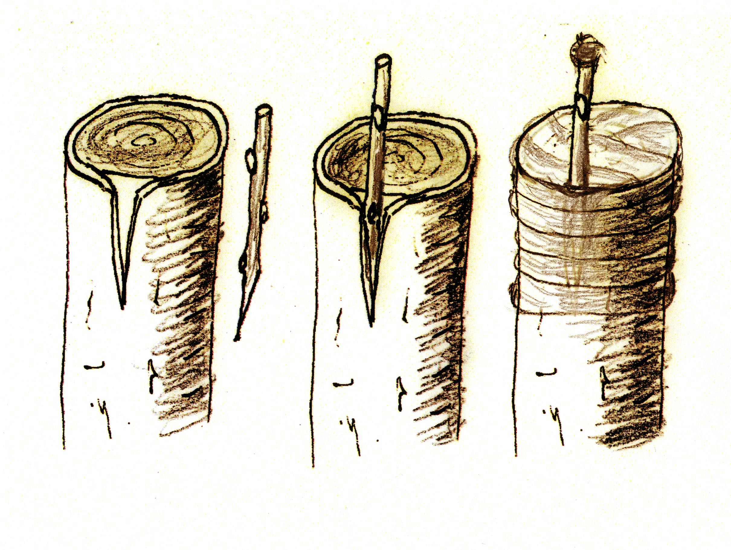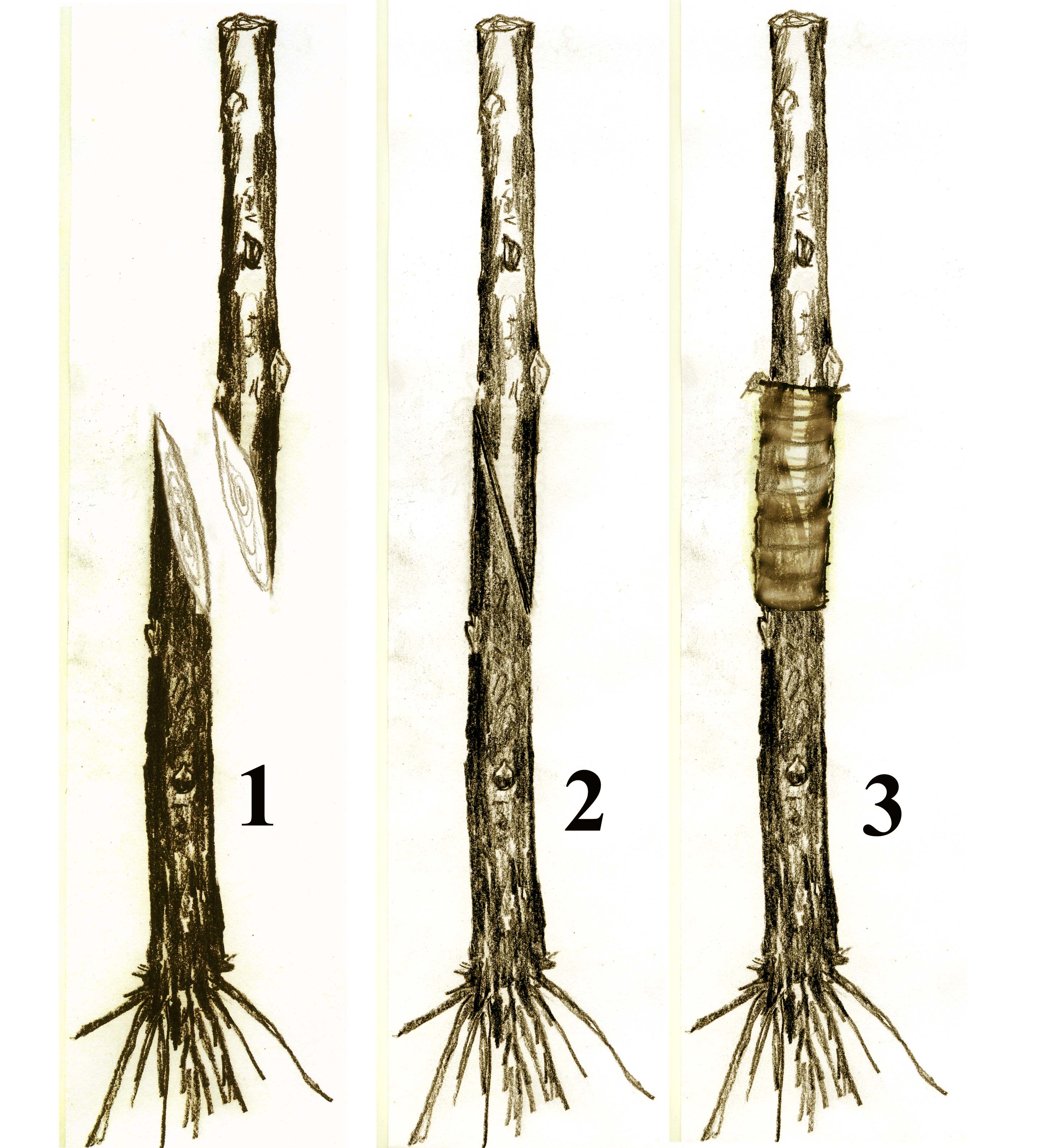träd. Detta gör man vanligtsvis under våren. Från vänster: Nr 1 illustrerar den avskurna grundstammen (den med rötter) och biten som finns överst är det avskurna ympriset. Nr 2 Här ligger de skurna bitarna tillsammans, i verkligheten så håller man dem så mellan tummen och fingrarna. Nr 3 Här är de sammanbundna med vulkande trjp eller liknande. Nu kommer en läkning att ske i skarven och Kambiet kommer att bilda Kallus som är en sorts sårvävnad, det gör i sin tur att de olika bitarna växer ihop. |