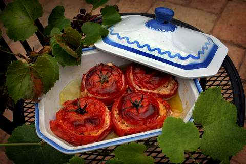 botten av fatet med de fyllda tomaterna doppar man sedan